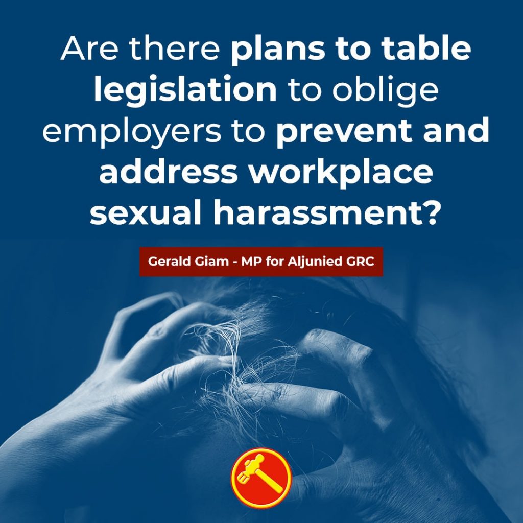 Among his replies, the Minister said that where it concerns employers’ obligations to deal with workplace sexual harassment, this falls under the purview of Ministry of Manpower. He invited me to file a Parliamentary Question for MOM, which I will.